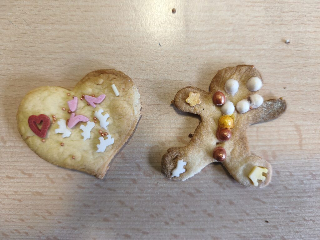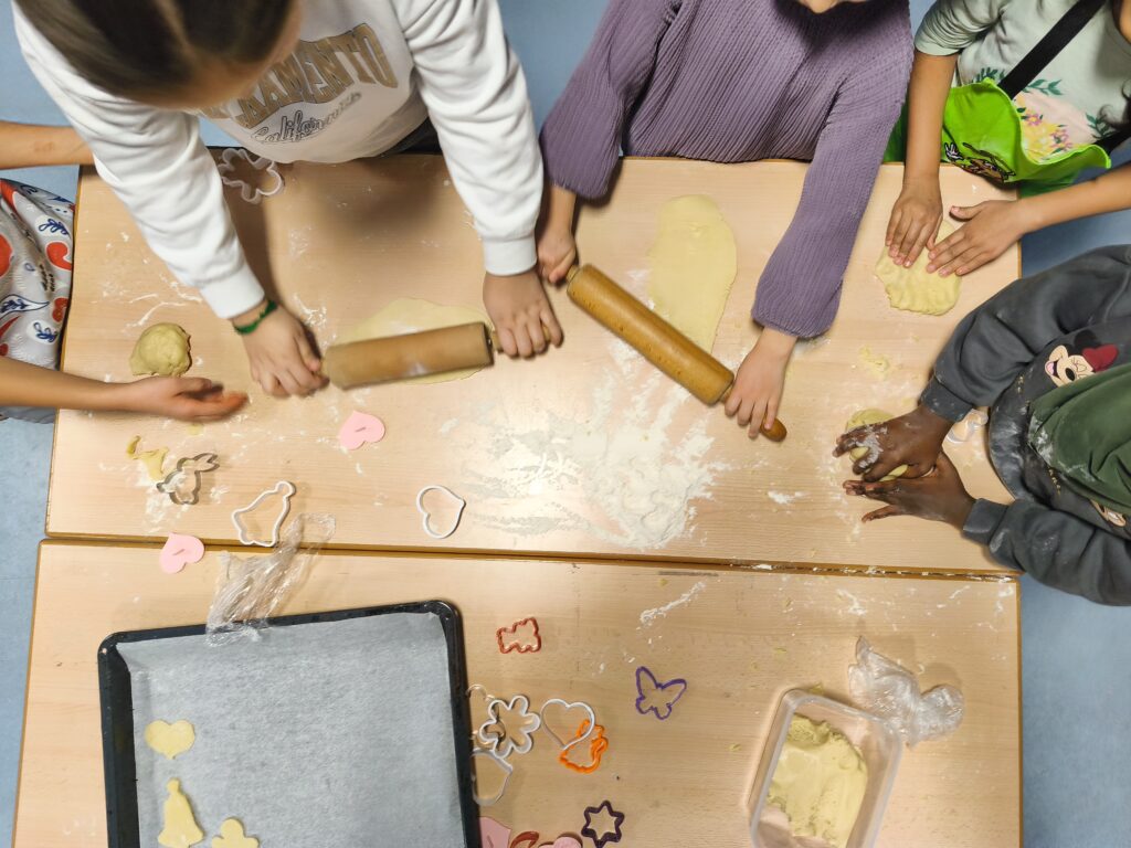 Im Erdgeschoss herrschte emsiges Treiben und ein wunderbarer Duft. Die 2f und die 4f haben sich zusammengetan, um gemeinsam Plätzchen für die Weihnachtszeit zu backen. Mit viel Begeisterung wurde geknetet, ausgerollt und ausgestochen. Es war eine Freude zu sehen, wie die Schülerinnen und Schüler der verschiedenen Jahrgangsstufen Hand in Hand arbeiteten und sich gegenseitig halfen. Am Ende waren die Backbleche gefüllt mit einer bunten Vielfalt an kleinen Kunstwerken, die nicht nur lecker aussahen, sondern auch mindestens genauso gut schmeckten.